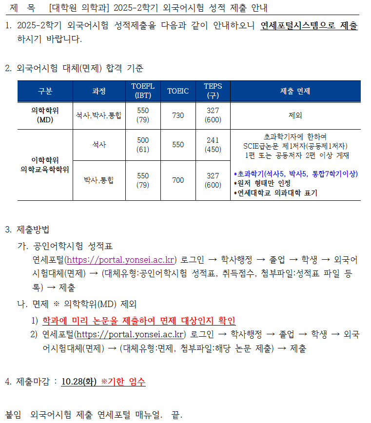 [대학원 의학과] 2025-2학기 외국어시험 성적제출 안내(~11.6까지 연장*)