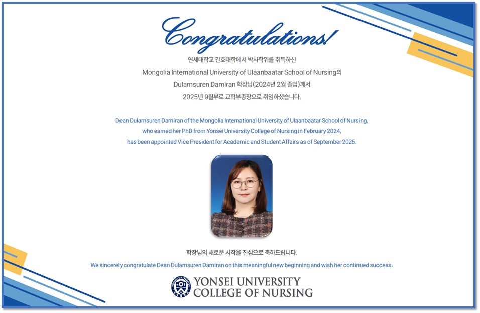 News [Spotlight] Appointment of Dean Dulamsuren Damiran as Vice President for Academic and Student Affairs 관리자 2025-09-12 조회수 476 공유하기 공유하기 페이스북 네이버블로그 카카오톡 카카오스토리 닫기 목록 이전글연세대학교 간호대학생, '유일한 아카데미' 수상 다음글연세대 간호대학 석사과정생 3명, 홍콩중문대 PhD Summer Workshop 추천 및 참여